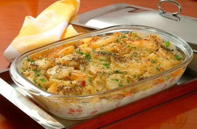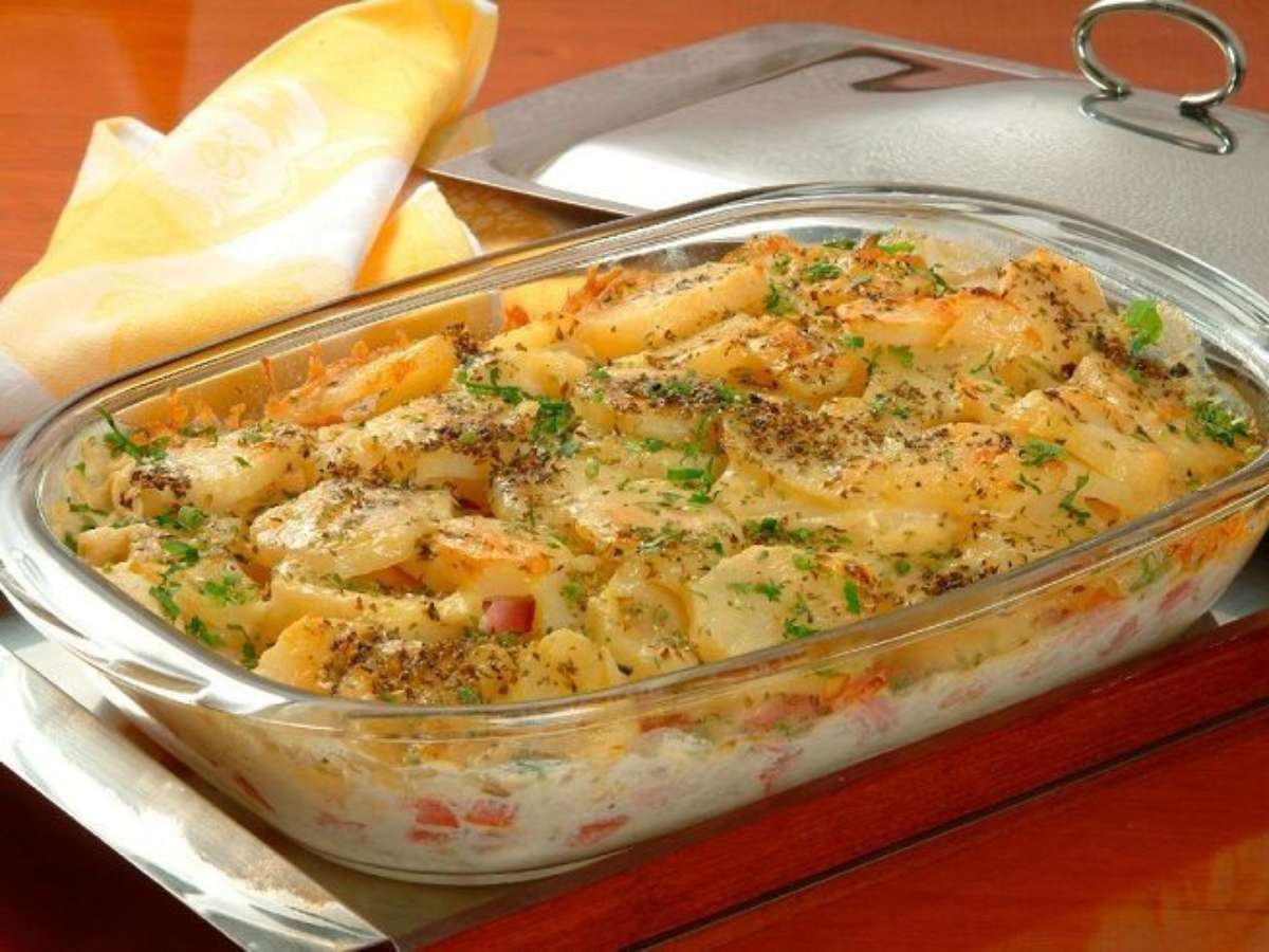 Batata gratinada com presunto e queijo para o jantar