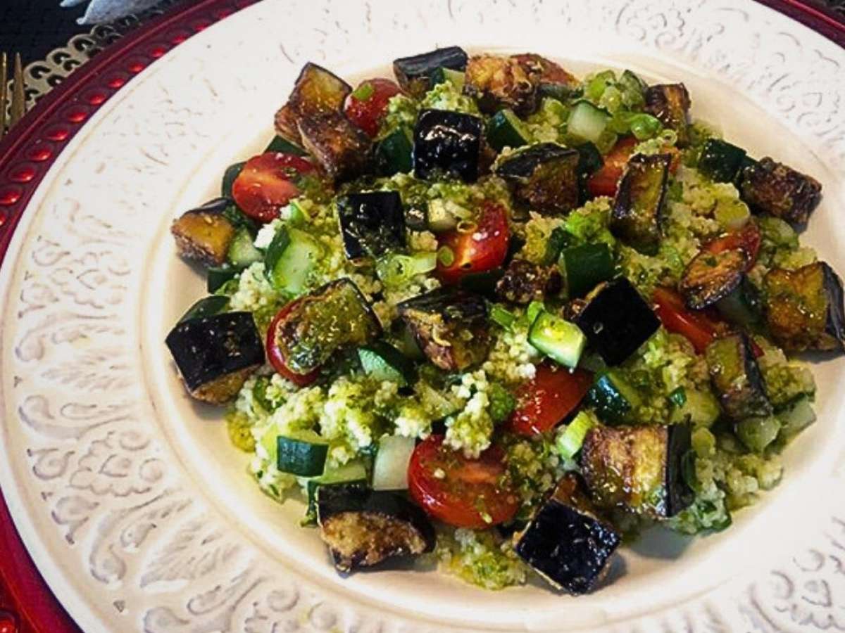 Um tabule com couscous e manjericão, servido com berinjela crocante e ingredientes frescos