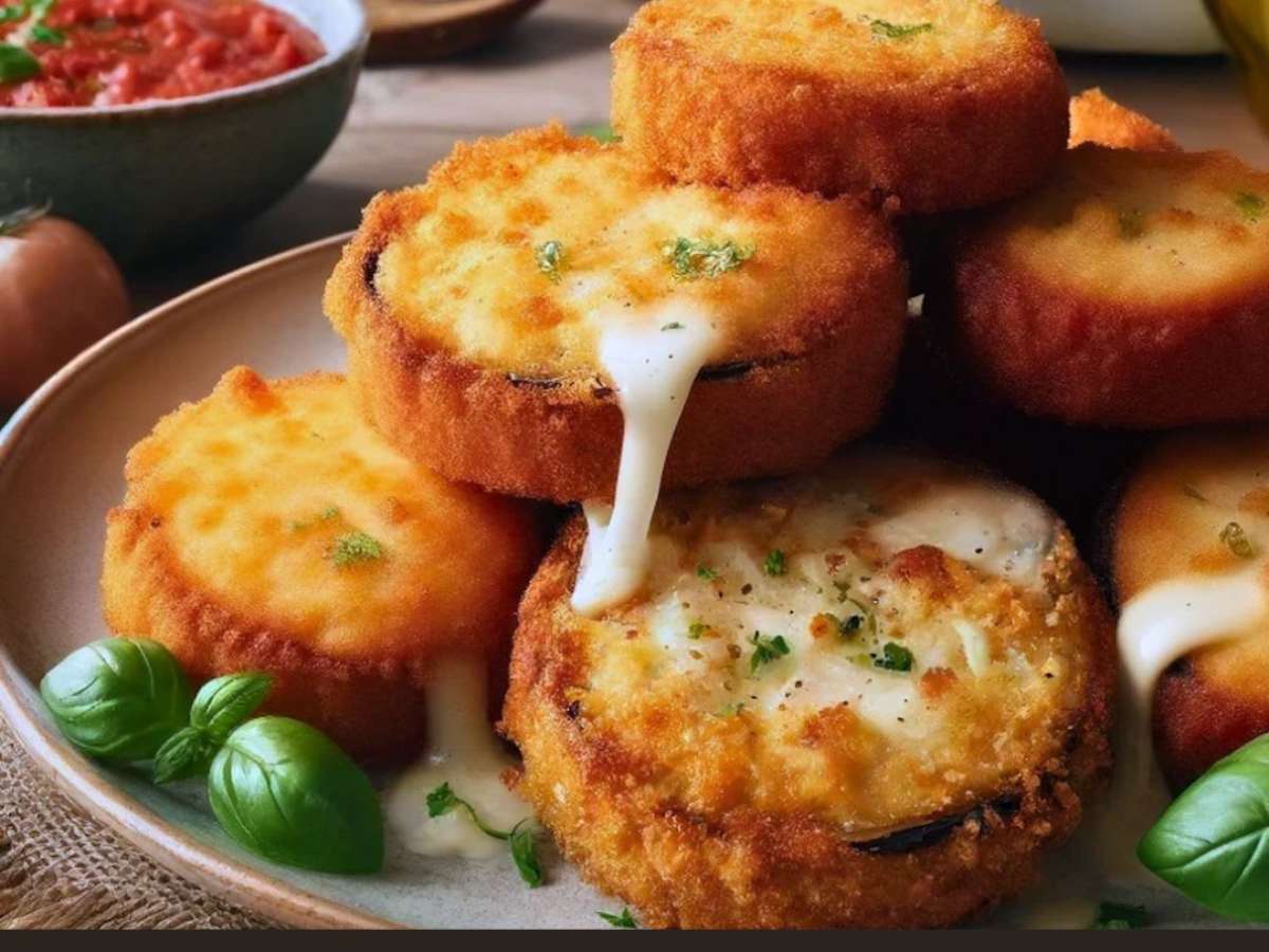 Uma receita fácil para a airfryer, de berinjela crocante recheada com queijo que parece um sanduíche sem pão