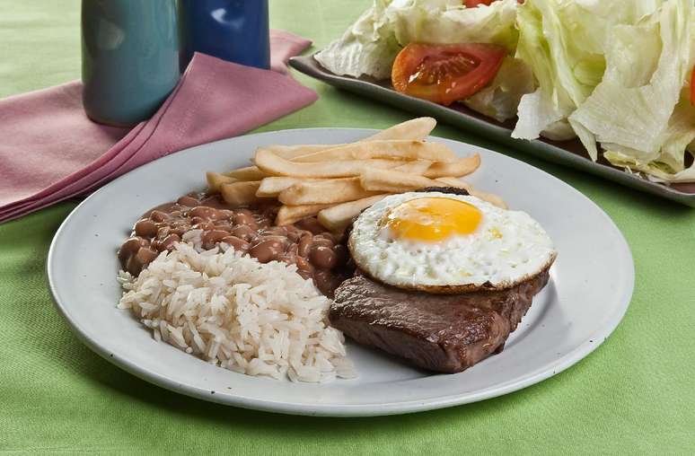 - Sirva cada bife com um ovos em cima e guarneça com a salada. Sirva acompanhado de arroz, feijão e batata frita.