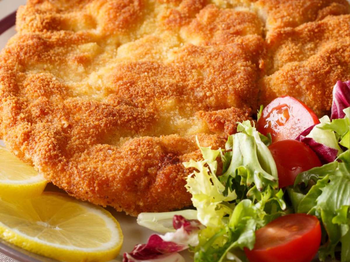 Um bife à milanesa que não precisa fritar e que usa farinha de mandioca para empanar.