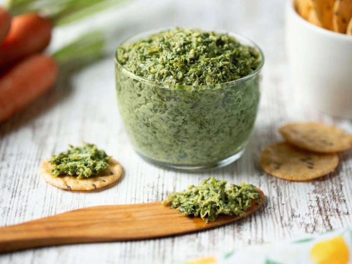 - Para o pesto, misture o manjericão, o alho, o parmesão ralado e o azeite. Reserve