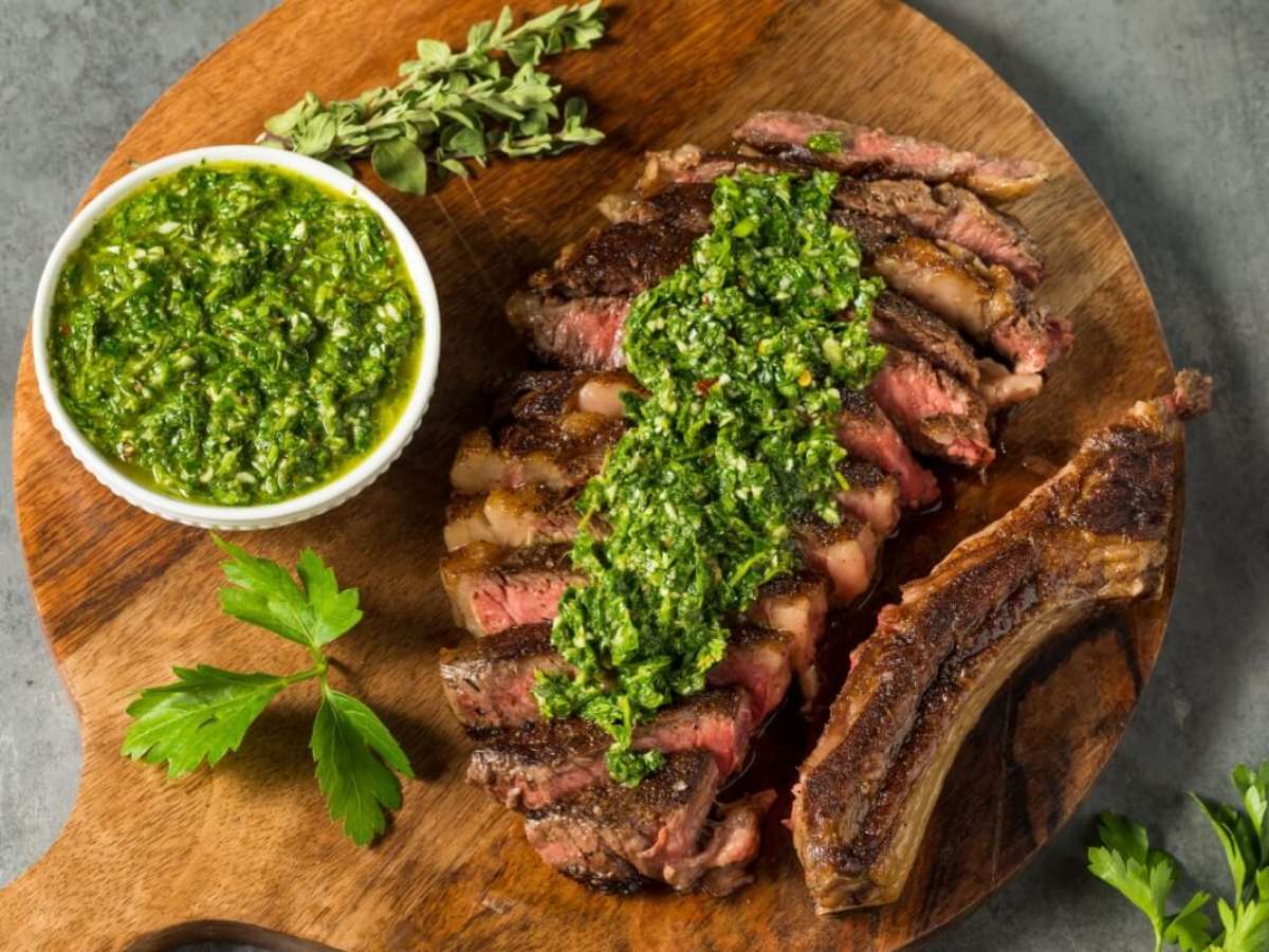 Tempere o bife com sal e pimenta-do-reino. Aqueça uma frigideira em fogo médio até ficar bem quente. Adicione o azeite restante e coloque os bifes, deixando dourar sem mexer até formar uma crosta. Vire e sele o outro lado também em fogo médio, mantendo o interior suculento. Retire os bifes do fogo e deixe descansar por alguns minutos antes de cortar. Disponha as fatias em uma tábua ou prato, regue com o molho chimichurri por cima e sirva em seguida.