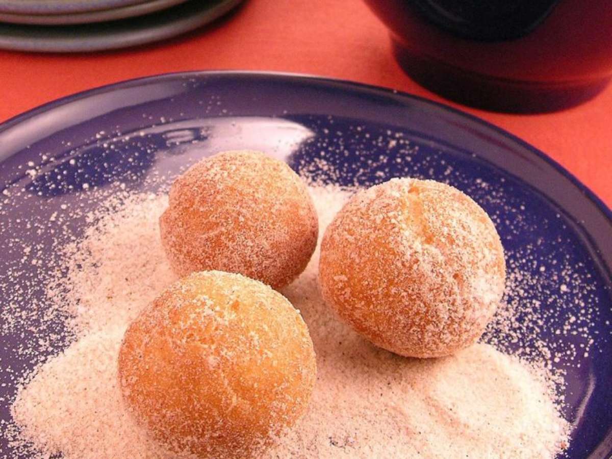 Em uma tigela, misture os ingredientes, menos a farinha. Mexa bem e vá acrescentando a farinha aos poucos até que não grude nas mãos e que possa enrolar. Em seguida, faça bolinhas e frite em óleo quente deixando dourar por igual. Retire do fogo e deixe escorrer em papel-absorvente. Por fim, passe por açúcar e canela e sirva.