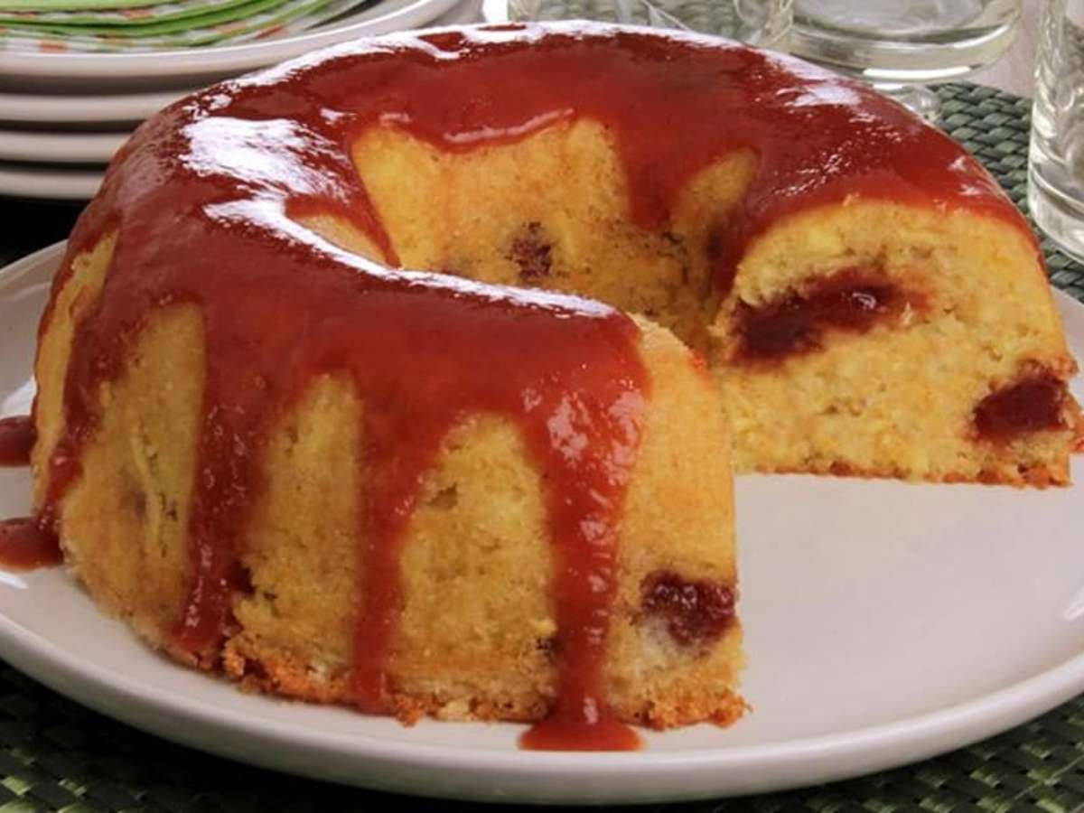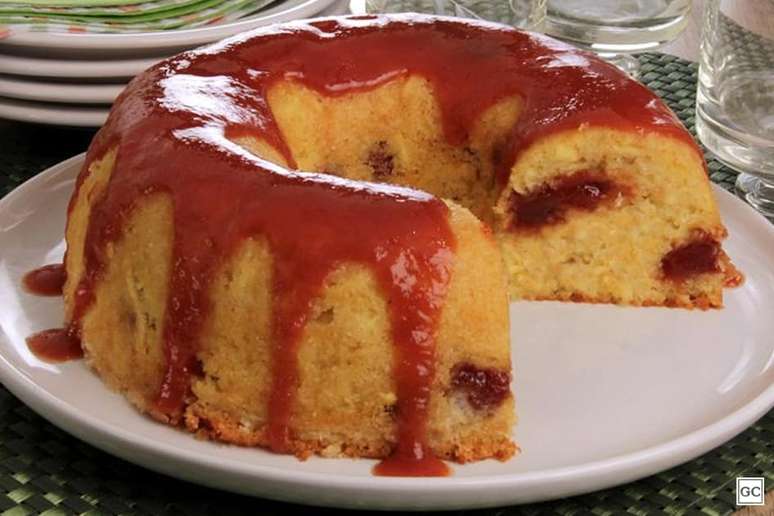 - Para a calda, leve ao fogo médio a goiabada e a água, mexendo até dissolver por completo. Despeje sobre o bolo e sirva