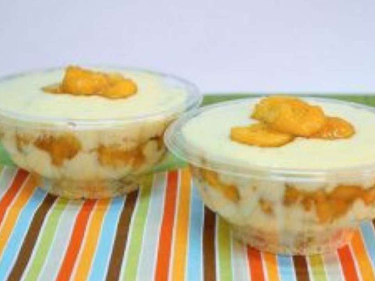 - Em potes transparentes individuais, faça uma camada de bolo esfarelado, uma de doce de banana e uma de creme, repetindo as camadas até acabarem os ingredientes, terminando em creme e decorando com doce de banana no centro.
