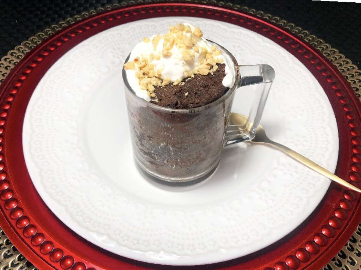 Bolo de caneca, com cacau e chantilly para saborear a qualquer momento