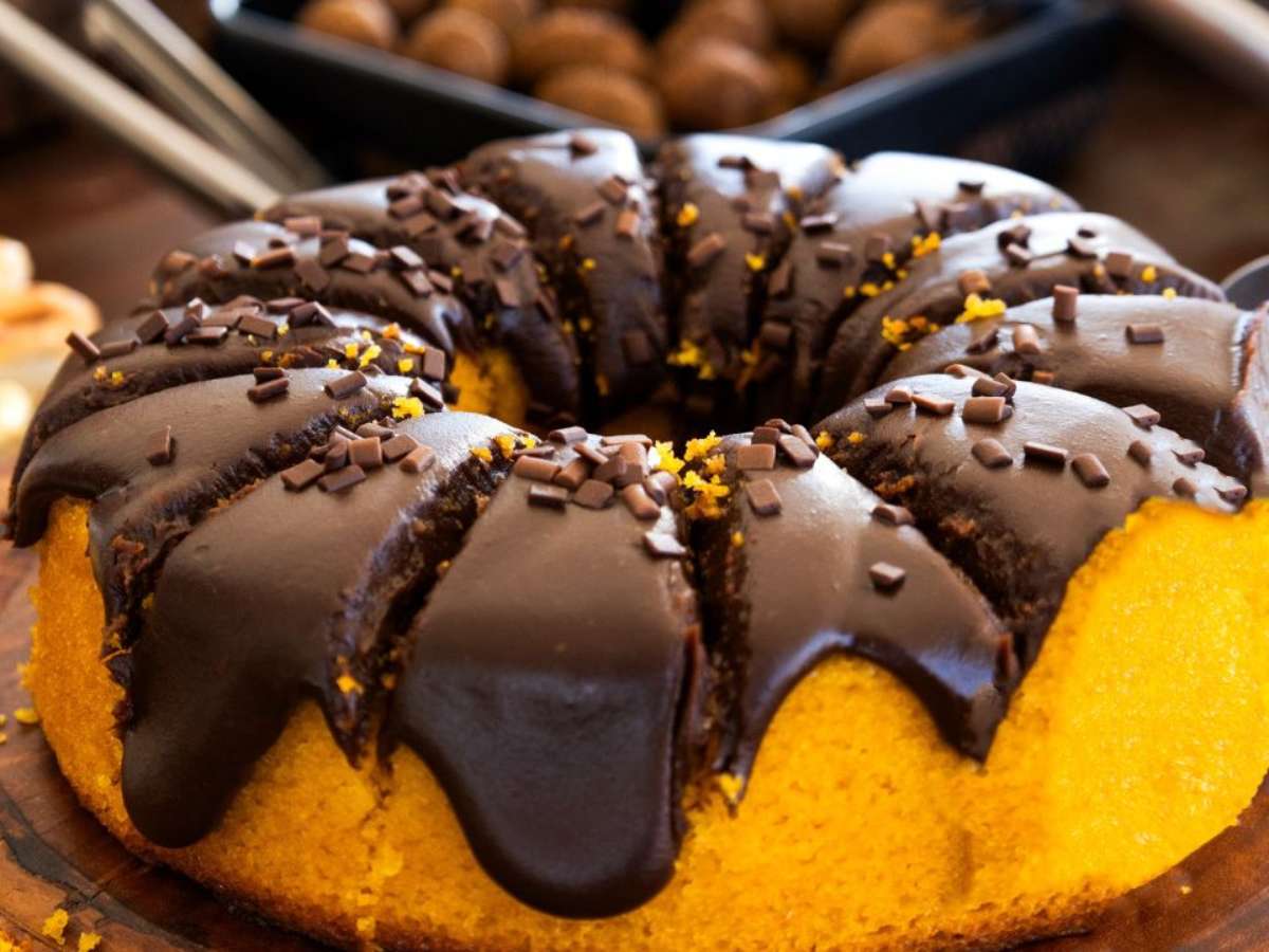 - Desenforme o bolo e, com um palito, faça furos no bolo e cubra com a calda ainda quente.