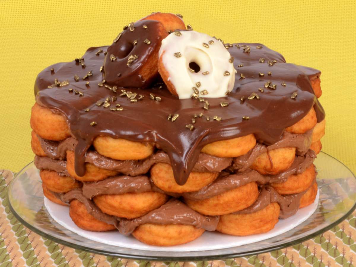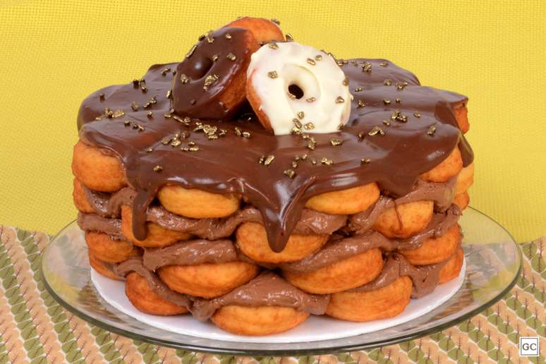 Você pode ter clicado nessa receita sem entender exatamente o que seria um bolo-donuts. Mas é exatamente o que parece, um bolo feito de vários donuts docinhos e deliciosos! Juntos, eles formam uma espécie de "torre" em formato de bolo e suas camadas são intercaladas com um recheio de lamber os dedos! A receita fica perfeita, especialmente para quem é uma formiguinha de plantão.