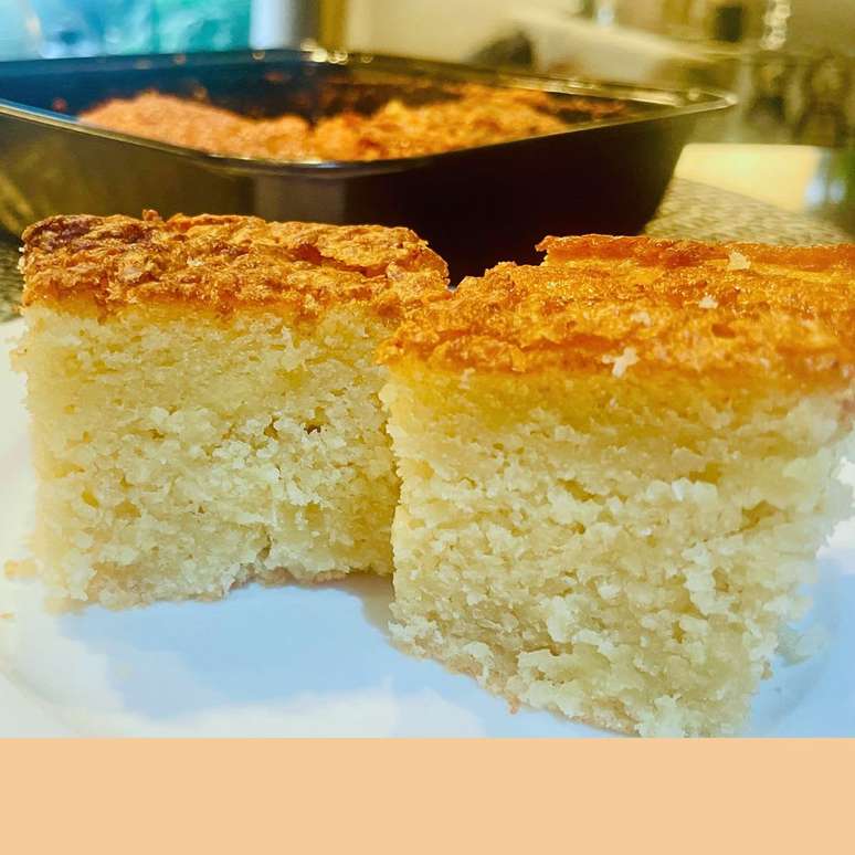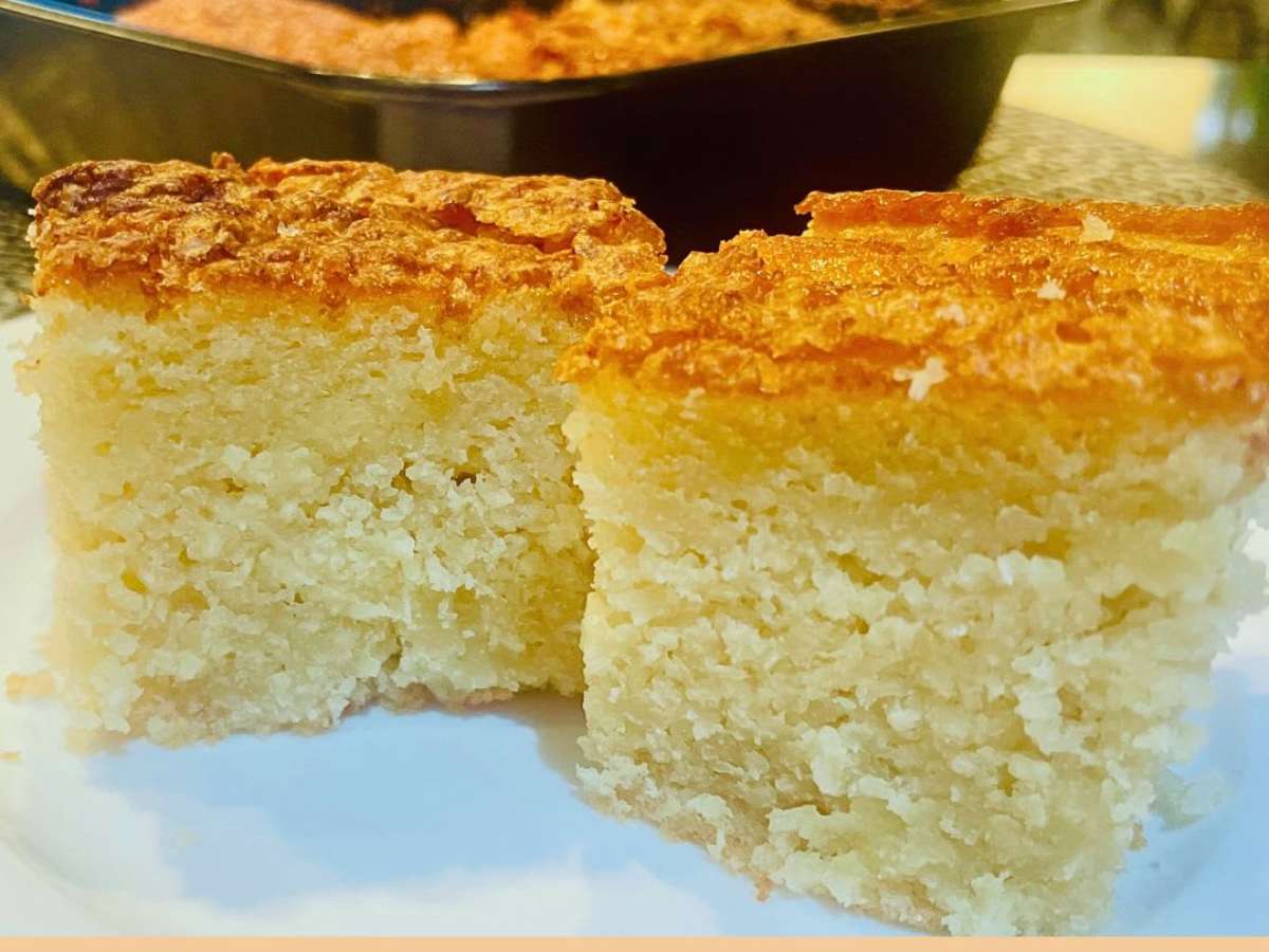 Um bolo de liquidificador úmido e saboroso sem trigo e sem leite que fica com uma camada de "queijadinha"na parte superior.