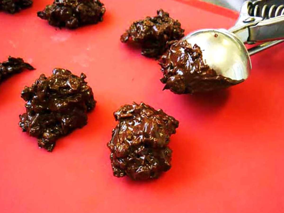 - Faça montinhos com o chocolate sobre uma folha de papel manteiga ou tapete de silicone, deixe secar bem por uma ou duas horas na geladeira, retire e deixe acabar de secar. Para facilitar o trabalho e obter porções com o mesmo tamanho utilize um boleador de sorvete.
