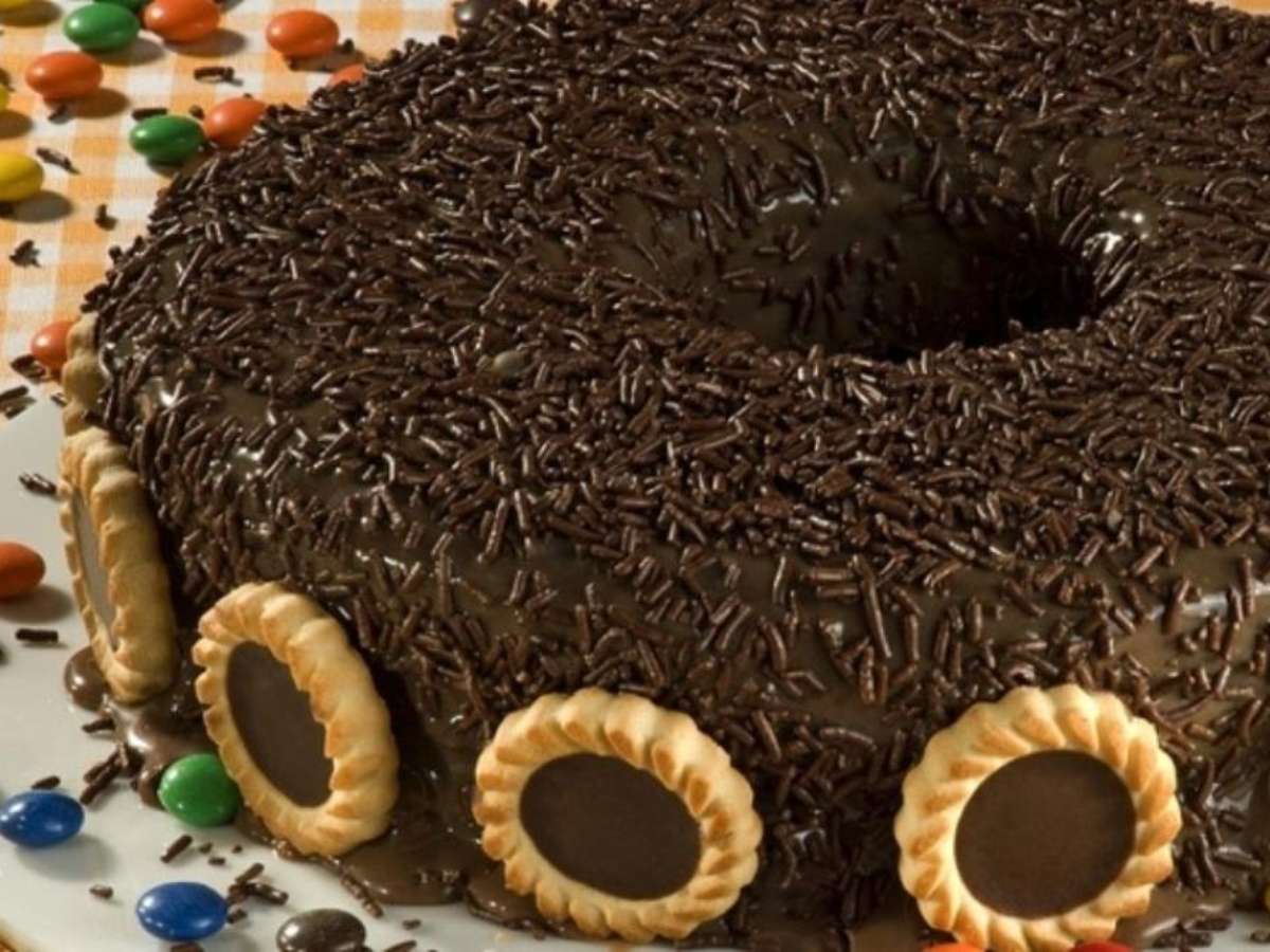 Para dar aquele toque especial, decore o brigadeirão com os biscoitos tipo tortinhas sabor chocolate ao redor e chocolate granulado por cima.