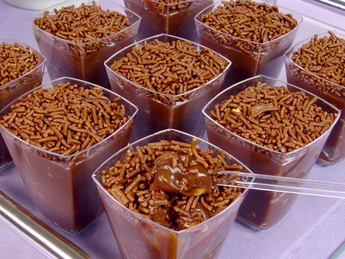 - Encha os copinhos com o creme e polvilhe com granulado. Leve à geladeira por 2 horas e sirva