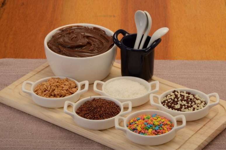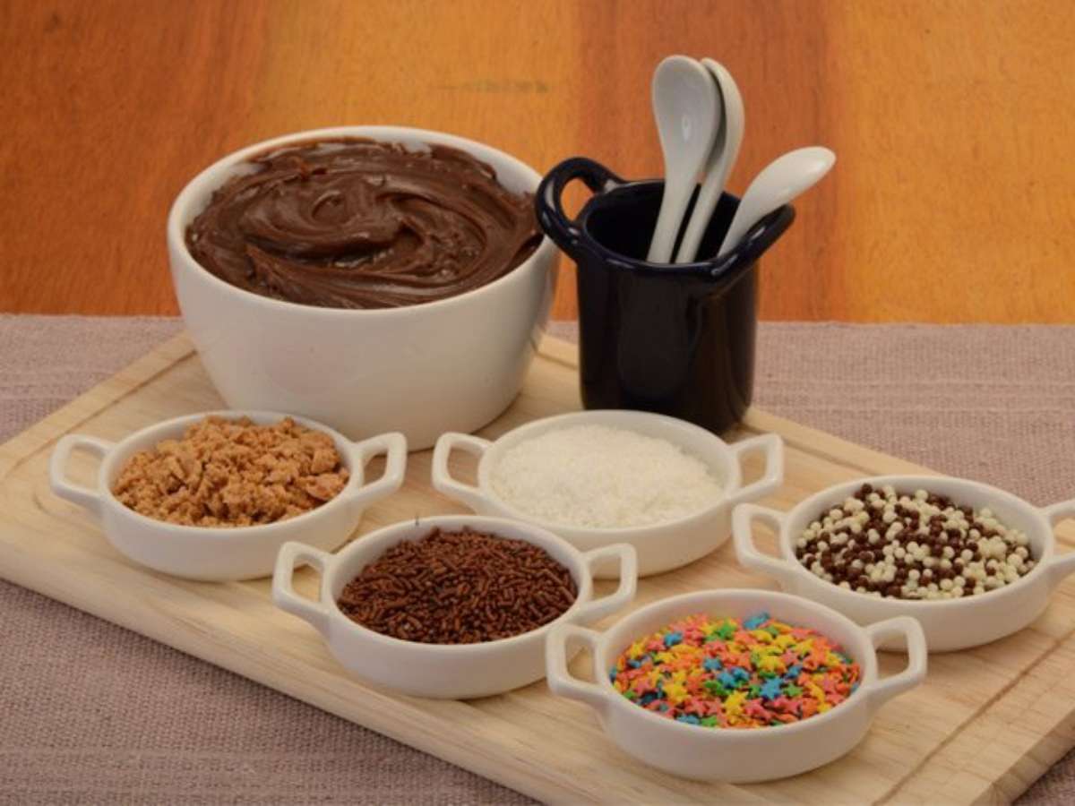 - Coloque os confeitos separadamente em travessas menores ao redor do brigadeiro cremoso e sirva com colheres