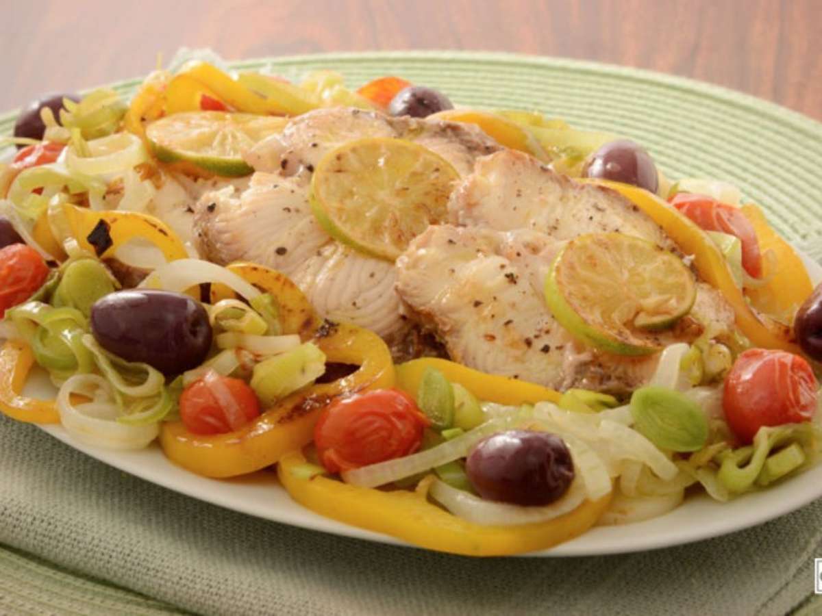 Tempere o peixe com o suco, o vinho branco, o alho, sal e pimenta. Forre uma fôrma com papel-manteiga untado e, por cima, faça uma camada com as batatas. Regue com azeite, tempere com sal e, sobre elas, coloque o peixe temperado. Cubra com o pimentão, a cebola, o alho-poró, o tomate e a azeitona. Regue com mais azeite, polvilhe com sal e cubra com as rodelas de limão. Em seguida, cubra com mais papel-manteiga e leve ao forno médio, preaquecido, por 40 minutos. Por fim, retire e sirva em seguida regado com mais azeite.
