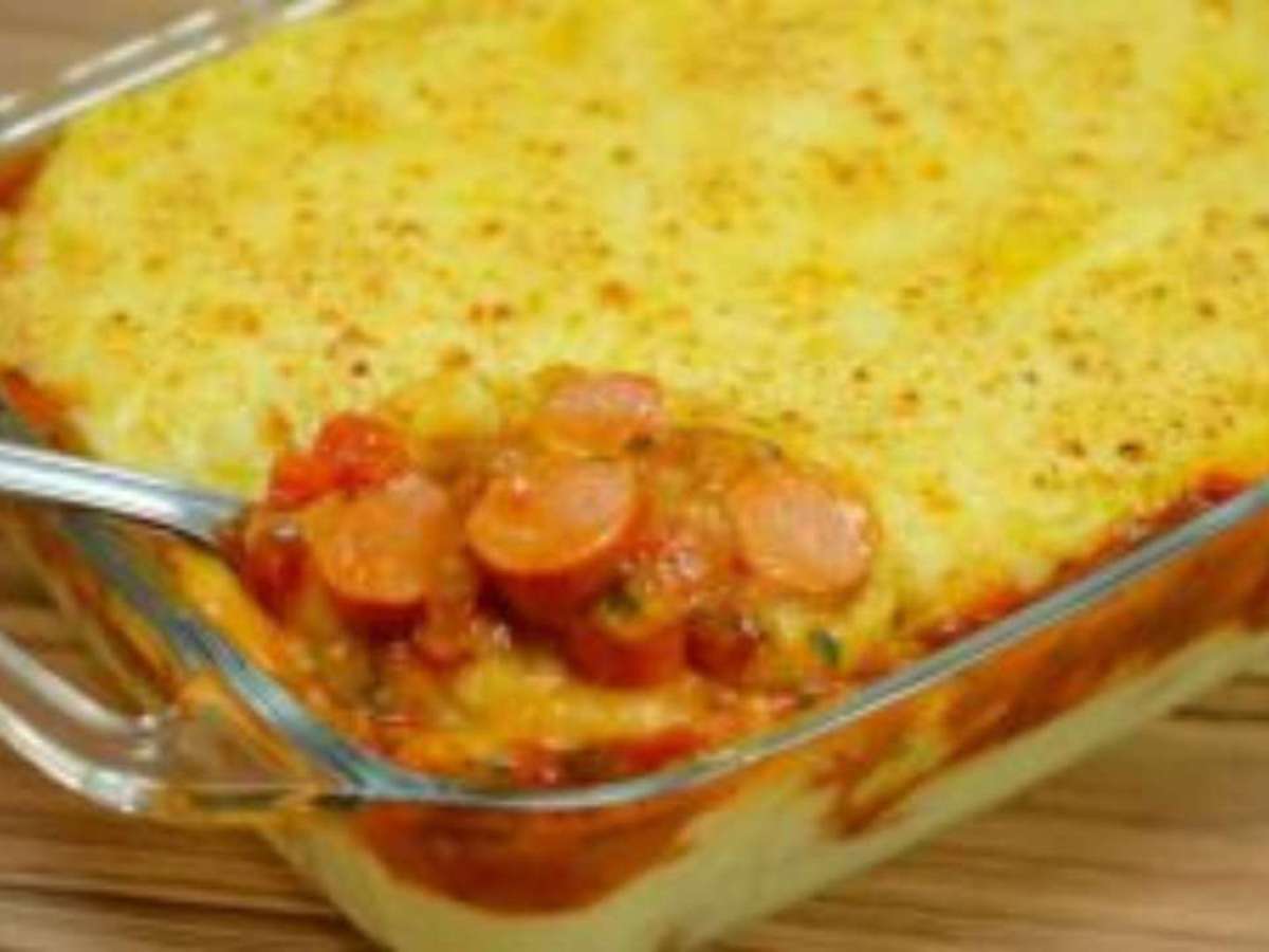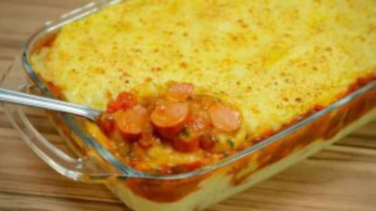 - Coloque o refogado de salsicha em um refratário untado e então espalhe o recheio