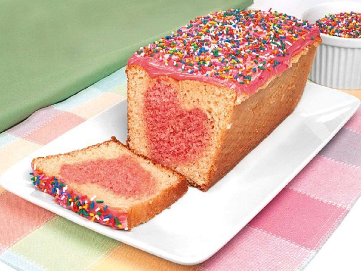 Despeje metade da massa em uma forma de bolo inglês grande untada e enfarinhada, coloque os corações de bolo em pé, um ao lado do outro ao longo da forma, e cubra com a massa branca restante. Leve ao forno médio, preaquecido por 30 minutos ou até dourar. Deixe amornar e desenforme.