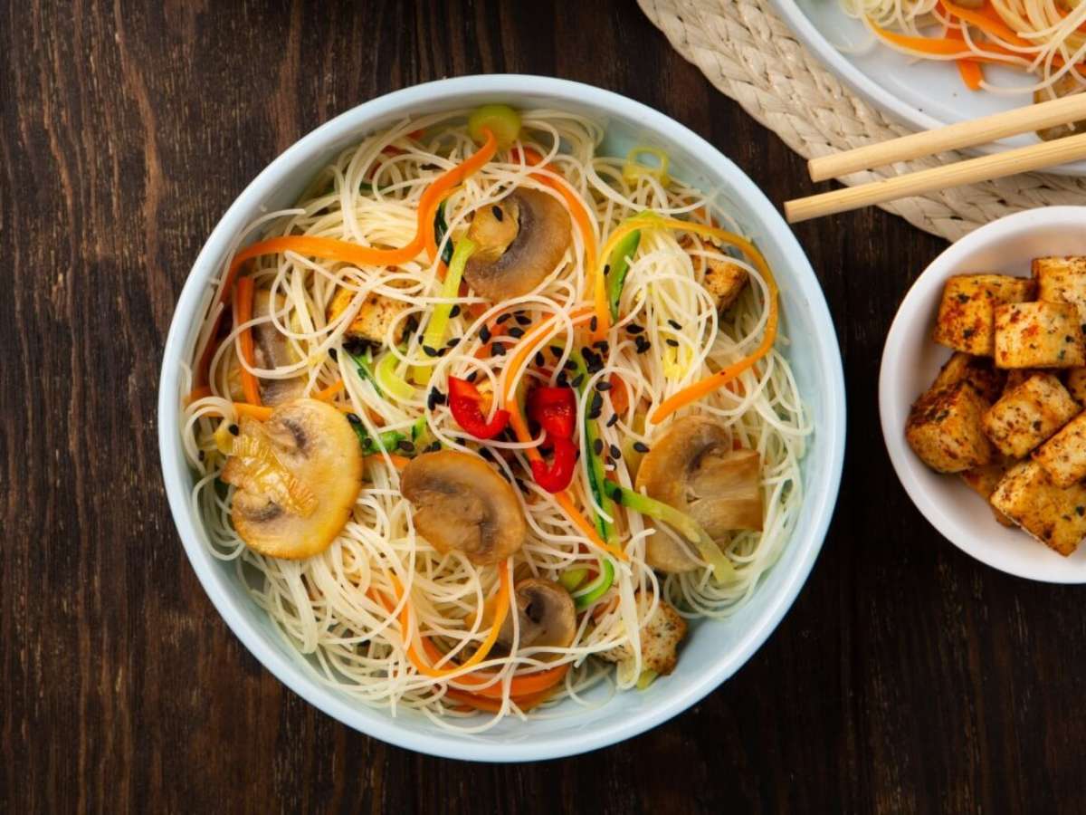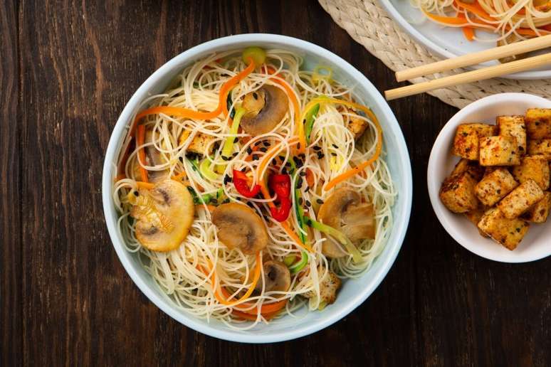 Macarrão de arroz com tofu, cogumelo e legumes salteados
