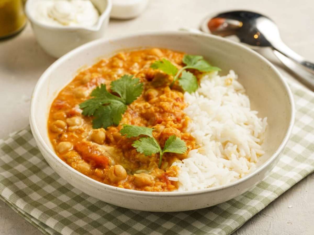 Coloque o arroz branco ocupando metade do prato, sirva o curry de lentilha com grão-de-bico na outra metade e finalize com folhas de coentro fresco por cima.
