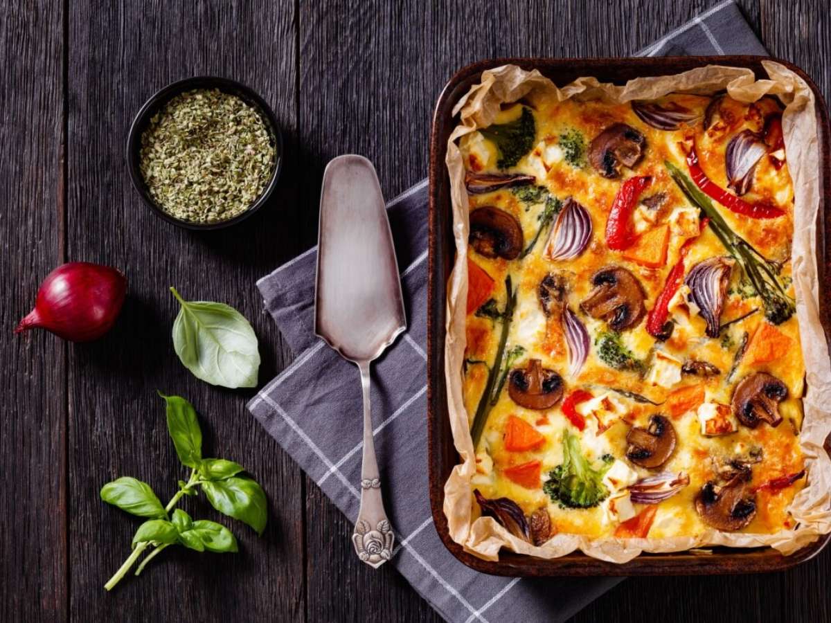 Espalhe os legumes salteados no fundo da assadeira. Distribua o queijo feta por cima. Despeje a mistura de ovos, cobrindo tudo de maneira uniforme. Ajuste os legumes com uma colher para garantir que fiquem bem distribuídos.Leve ao forno preaquecido a 200 °C por 25 a 30 minutos, até dourar bem e firmar completamente no centro. Retire do forno e deixe descansar por cinco minutos antes de cortar.