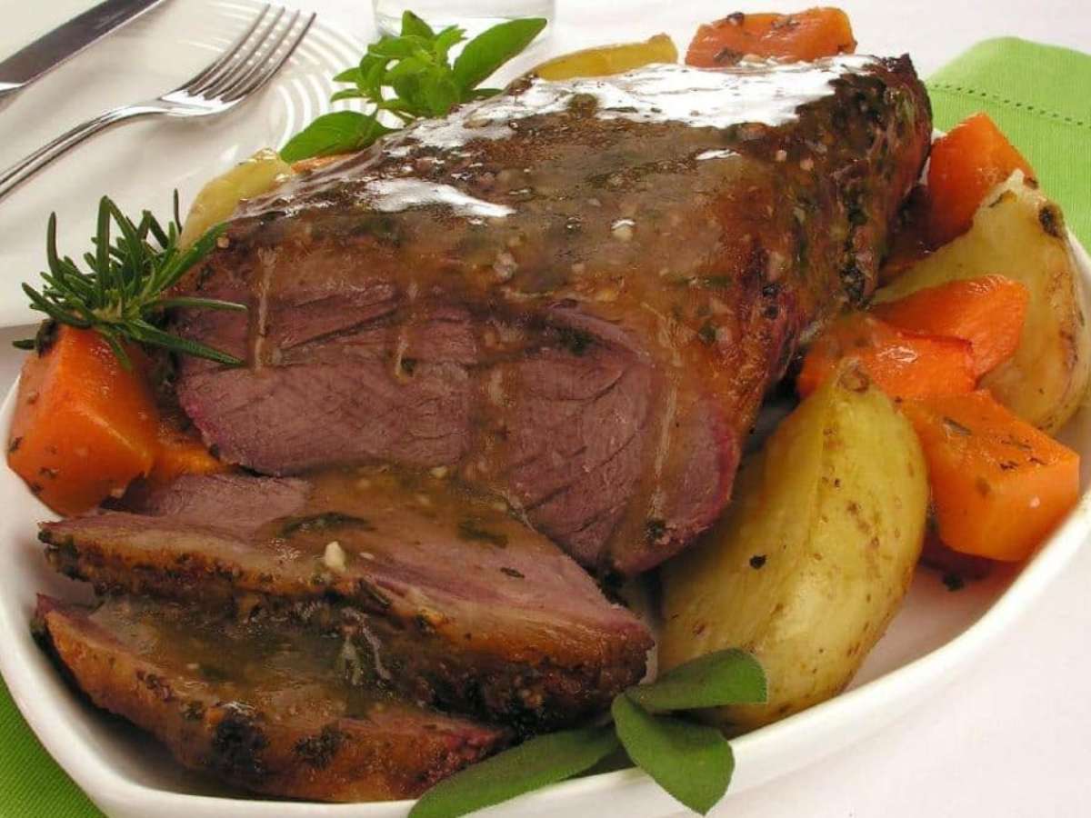 - Retire a carne e os legumes da assadeira e transfira para uma travessa fatie a carne, reserve.