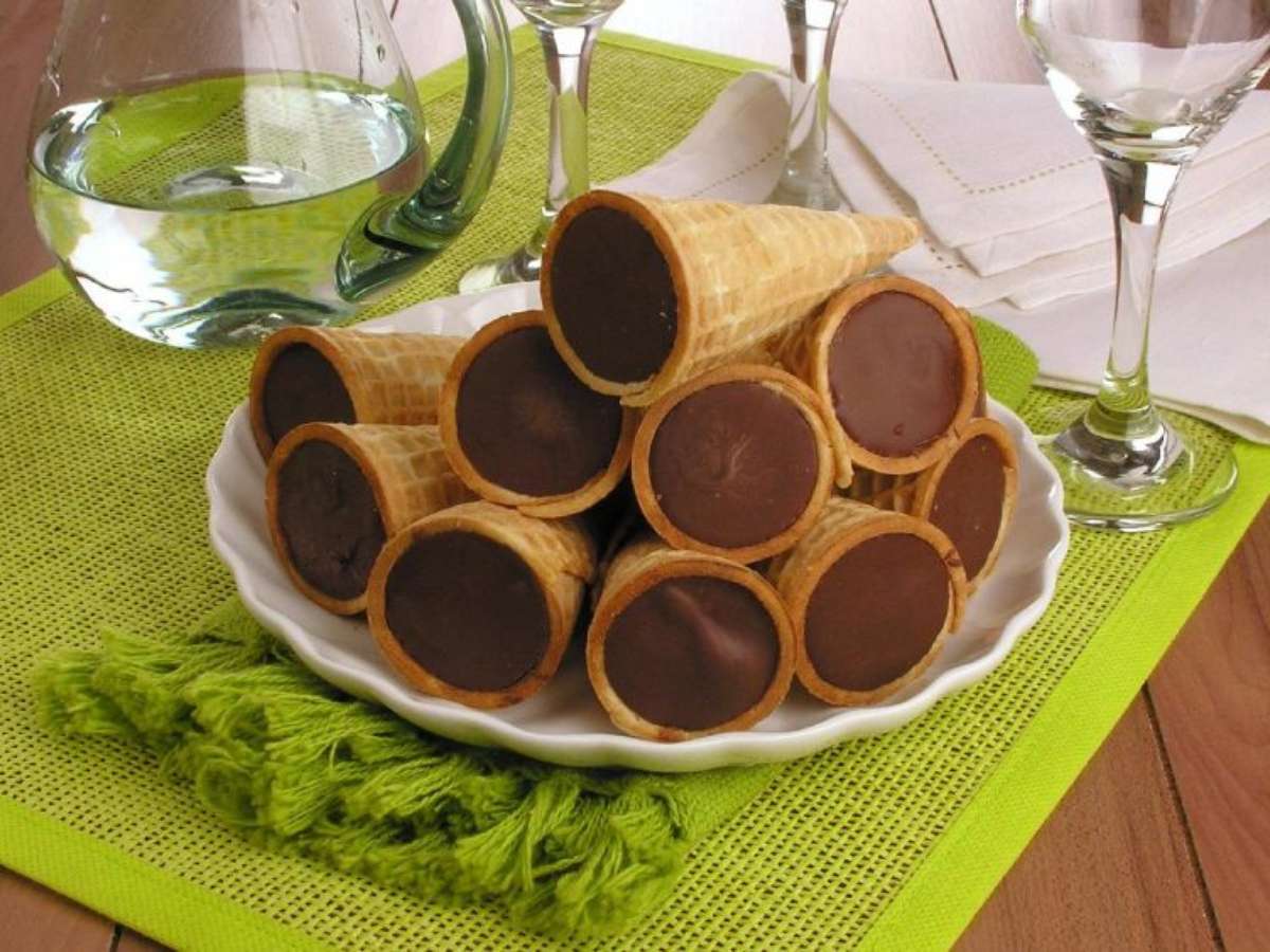 Derreta os chocolates da trufa em banho-maria. Depois de derretidos, misture a bebida e o creme de leite e mexa até misturar. Recheie os cones e leve à geladeira por 30 minutos. Derreta o chocolate para cobertura e mergulhe os cones ligeiramente para cobrir o topo. Vire batendo para escorrer o excesso e deixe secar por 5 minutos antes de servir.