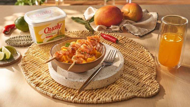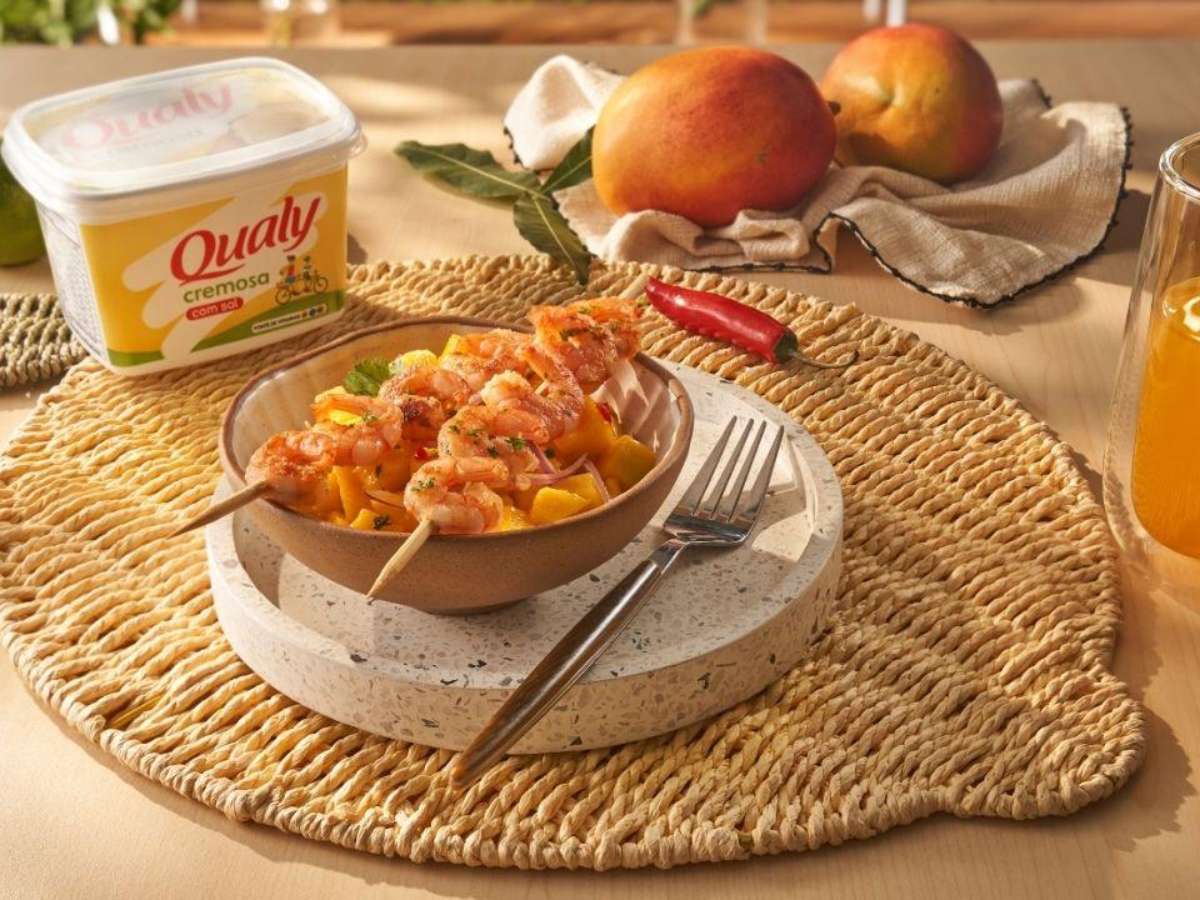 Nesta receita de Qualy, a manga Palmer assume o protagonismo, trazendo uma doçura que contrasta perfeitamente com a acidez do limão. Acompanhado por espetinhos de camarão dourados, o prato se transforma em uma refeição completa e leve.