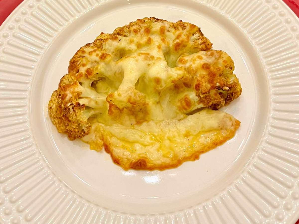 Couve-flor gratinada com queijo e muito saborosa, cortada em fatias grossas, fácil de preparar - no forno ou na Airfryer.