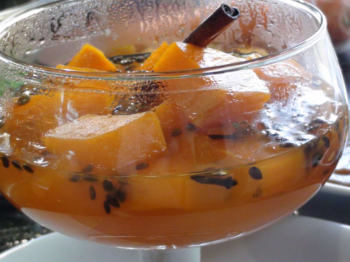 Coloque os pedaços (quadradinhos de 1 ou 2 cm2) de abóbora em uma panela de pressão, em cima da abóbora a polpa de maracujá com sementinhas, adicione o açúcar o cravo e a canela. Não mexa. Feche a panela de pressão e deixe por mais ou menos 2 horas fechada; coloque a panela de pressão no fogo, e quando começar a chiar, conte 5 minutos (fogo médio baixo), desligue a panela e só abra depois de bem fria.