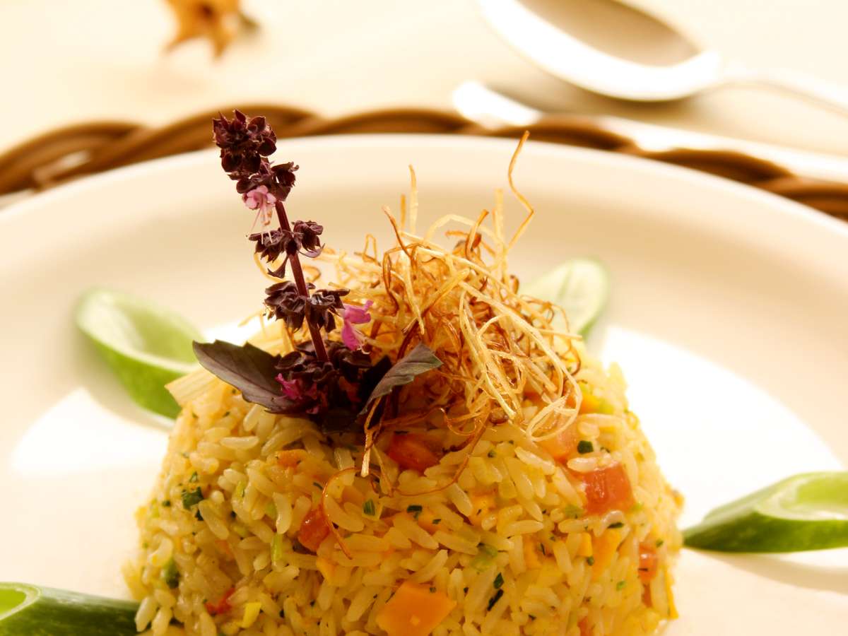 Distribua o arroz sobre os pratos individuais e decore com cebolinha e salsinha.
