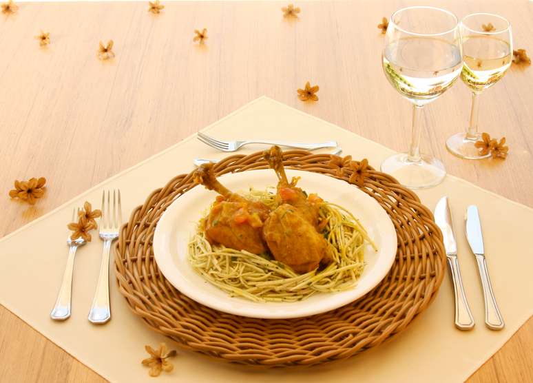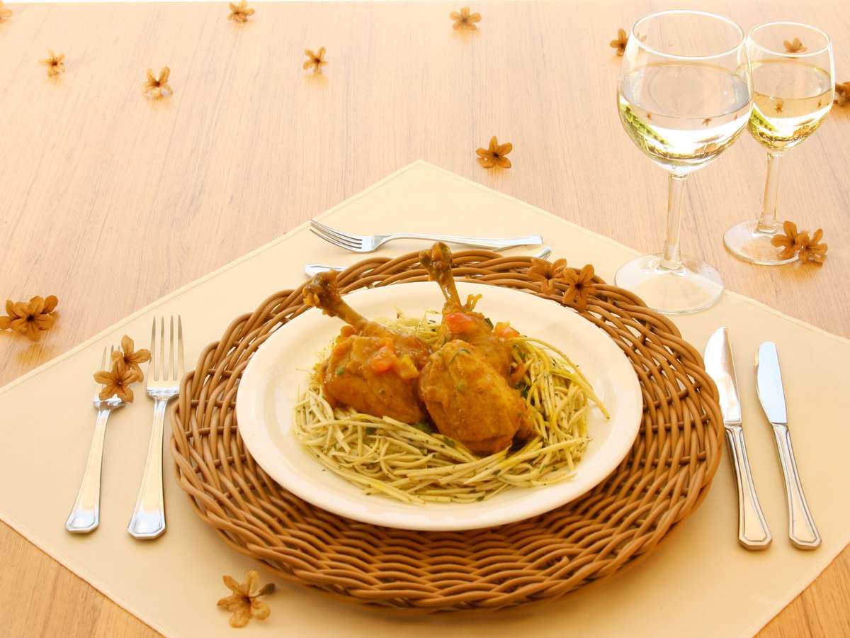 Frango caipira com espaguete de guariroba (serve seis pessoas)