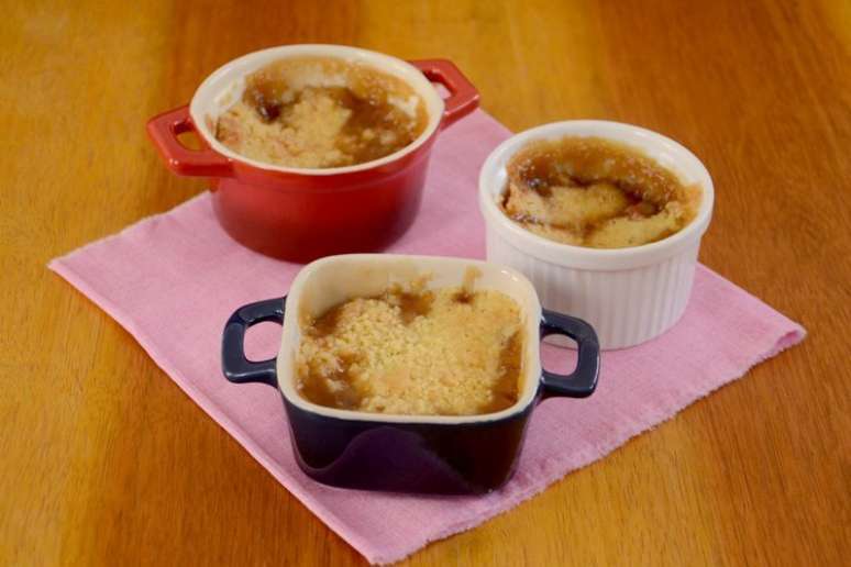 Corte a manteiga gelada em cubinhos e misture com as pontas dos dedos com a farinha e o açúcar até formar uma farofa. Logo, reserve na geladeira por 20 minutos. Para o recheio, misture bem os ingredientes e coloque no fundo de forminhas refratárias tipo ramequins. Assim, cubra com a farofa reservada na geladeira e leve ao forno médio, preaquecido, por 25 minutos ou até dourar a superfície. Por fim, retire, deixe amornar e sirva.