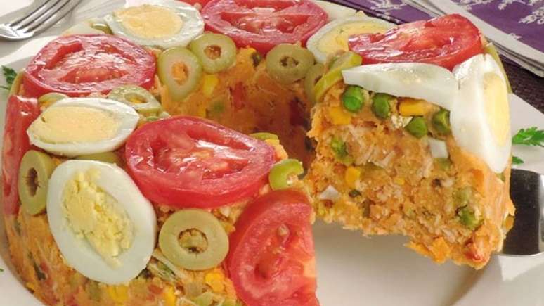 - Despeje em uma fôrma de buraco no meio de 24cm de diâmetro untada e decorada com tomate, ovo e azeitona, apertando com uma colher