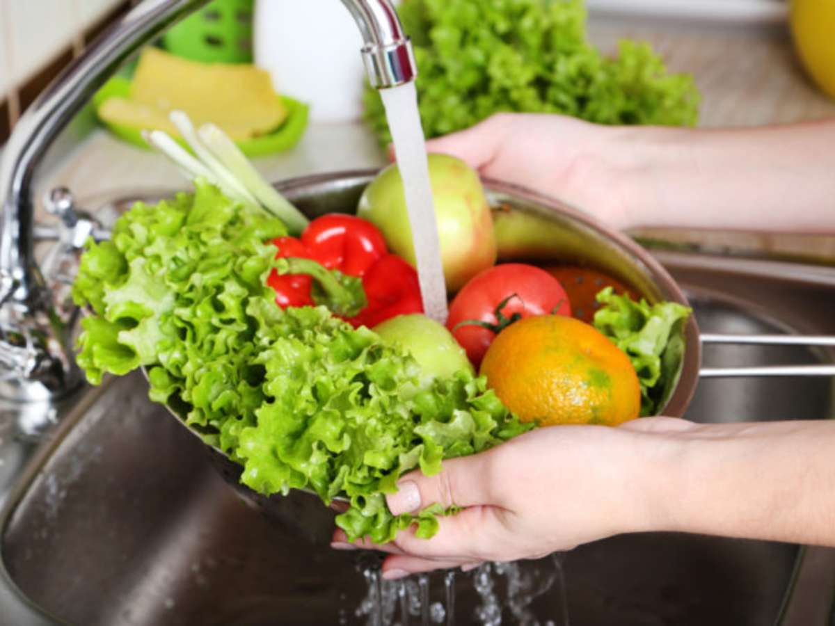 Para a maioria desses alimentos, a solução para a lavagem pode ser feita com duas colheres de sopa (em torno de 20 ml) de hipoclorito de sódio para cada litro de água. Deixe os alimentos de molho por alguns minutos e depois enxágue abundantemente com água corrente.