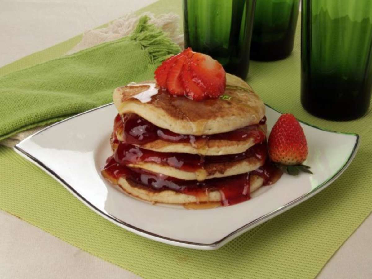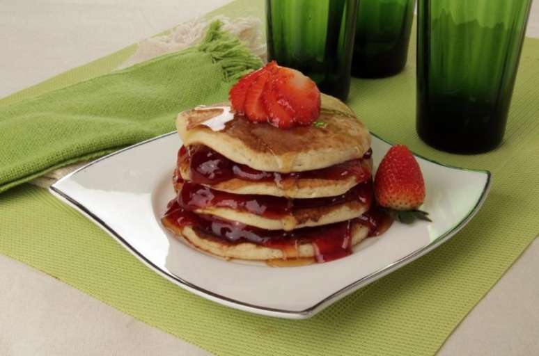 Para a massa, em uma tigela, misture a farinha, o fermento, o açúcar e o sal. Peneire e transfira para outra tigela. Junte aos ingredientes secos, o leite, a essência e o óleo, misturando com um batedor de arame. A massa deve ficar grossa. Em uma frigideira antiaderente média, untada, coloque uma concha média de massa. Assim que começar a formar bolhas e dourar as laterais, vire a massa para dourar do outro lado. Proceda da mesma forma com toda a massa. Faça 2 pilhas de panquecas com 4 massas cada. Em cada pilha, intercale massa e geleia, terminando em massa. Regue com mel e decore com morangos. Sirva em seguida.