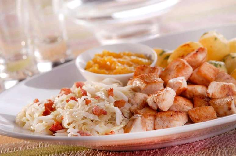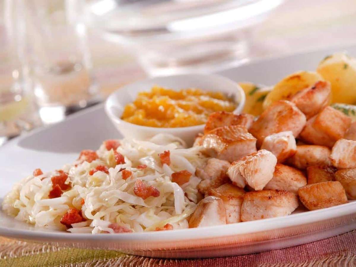 - Tempere com sal e acomode em um prato junto com as batatas e o repolho.