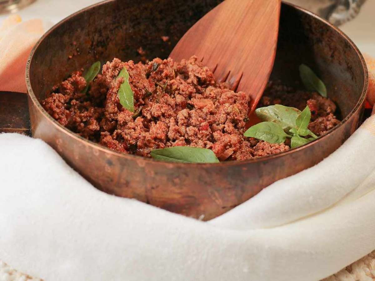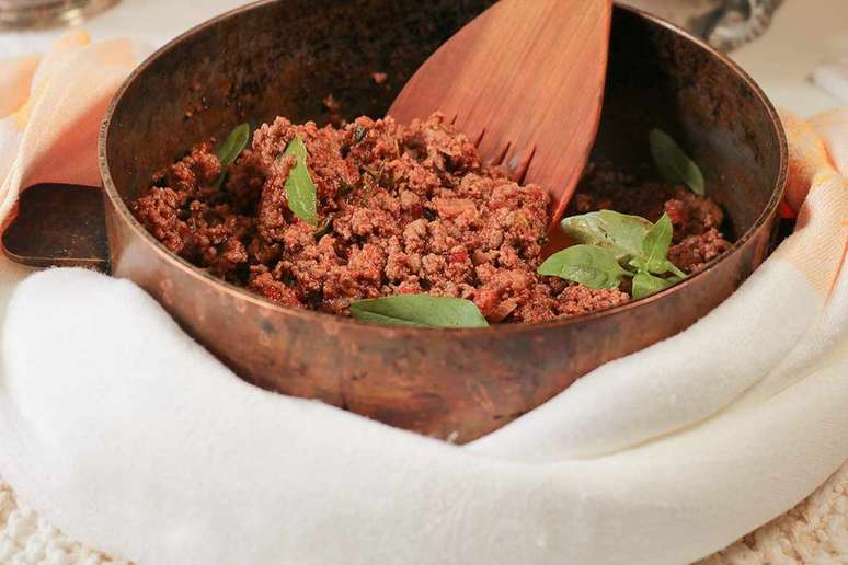 A carne moída preparada do jeito a seguir é muito diferente de um molho de tomate com carne moída. Primeiro, a quantidade de carne é maior do que a de molho de tomate. Portanto a quantidade de molho é suficiente para um molho suculento, porém a carne não fica afogada. As proporções são muito equilibradas. E, o tempero tem um pouco de pimenta do reino moída na hora, que aliás, acho que usamos muito pouco.