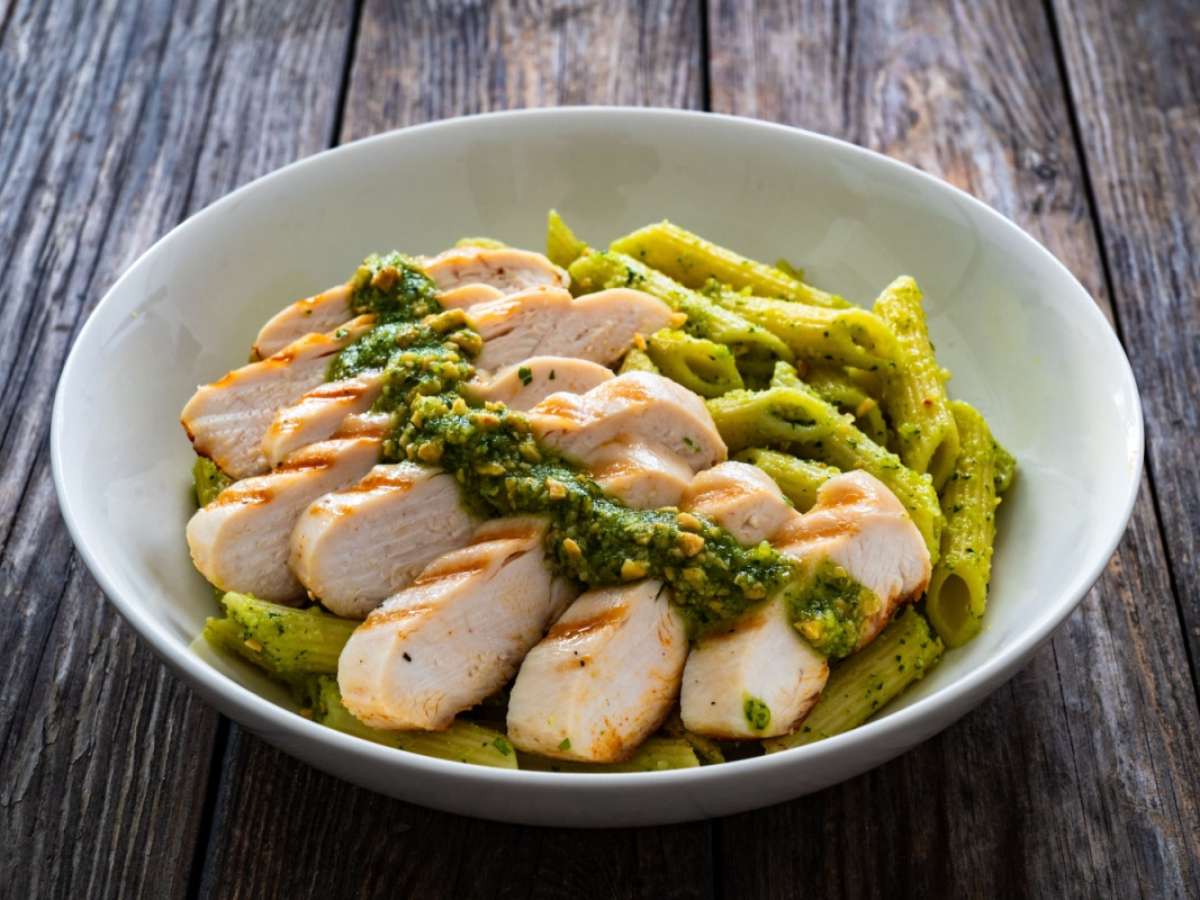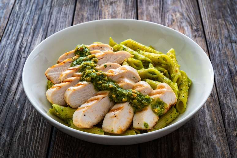 Em uma tigela, tempere os peitos de frango com suco de limão, sal e pimenta-do-reino. Aqueça uma frigideira com um fio de azeite em fogo médio e grelhe os peitos de frango até dourarem dos dois lados e ficarem cozidos por dentro. Corte em fatias.Em um pratomisture o macarrão ainda quente com o molho pesto, envolvendo bem. Disponha as fatias de frango grelhado por cima e finalize com um pouco de molho pesto. Sirva em seguida.