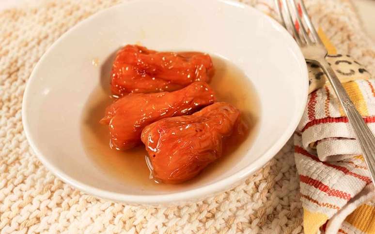 - Fure com um garfo várias vezes, e esprema-os com as mãos sobre uma vasilha. É importante retirar bastante caldo de cada caju para a calda poder penetrar bem nas frutas enquanto cozinham.