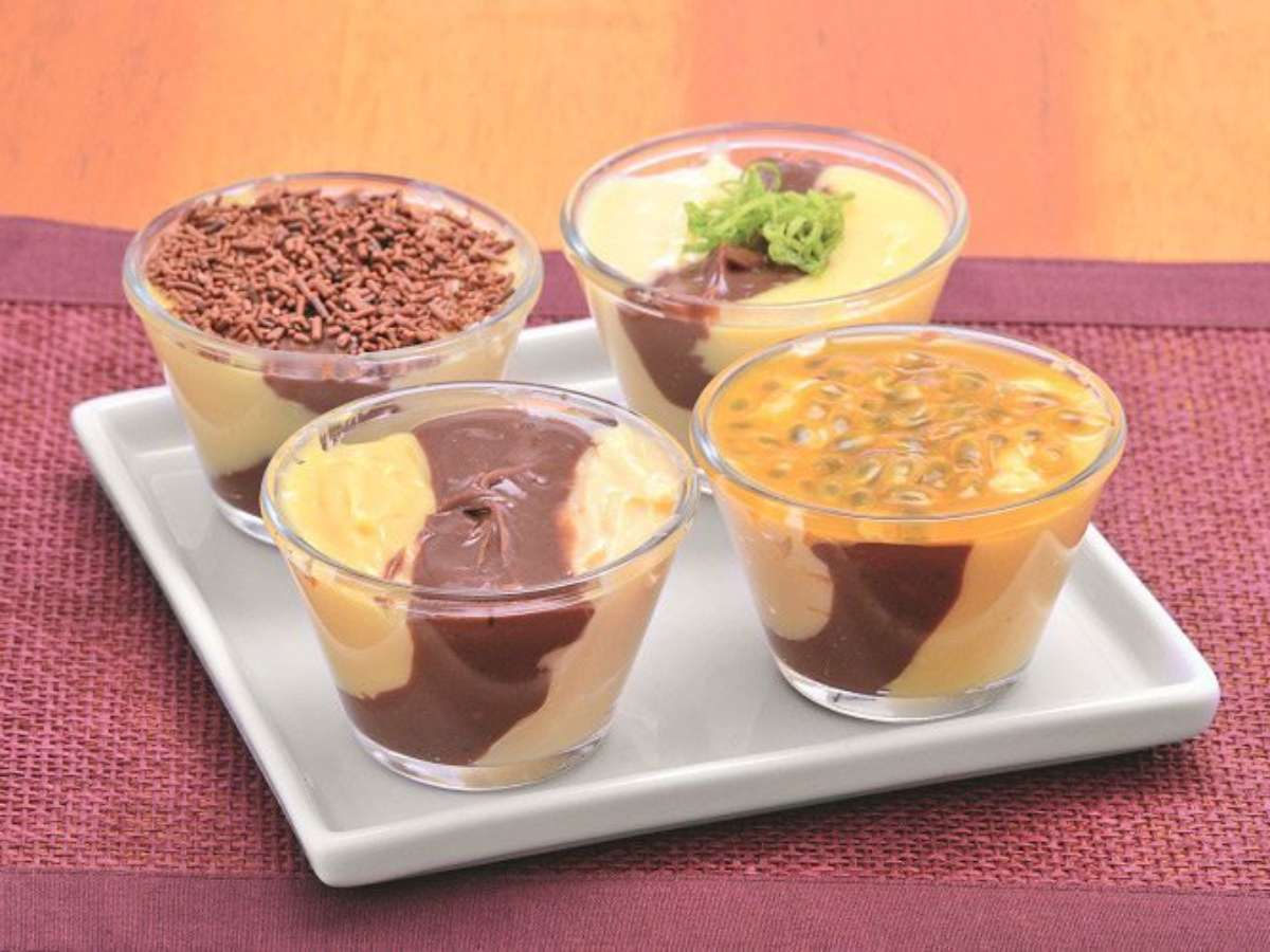 Leve outra panela ao fogo médio com o leite condensado, a manteiga e o chocolate branco restantes, e o suco de limão, mexendo até engrossar. Desligue e misture com o creme de leite restante. Divida os brigadeiros entre copinhos individuais transparentes, um brigadeiro ao lado do outro. Decore com as raspas de limão, granulado e polpa de maracujá. Sirva.