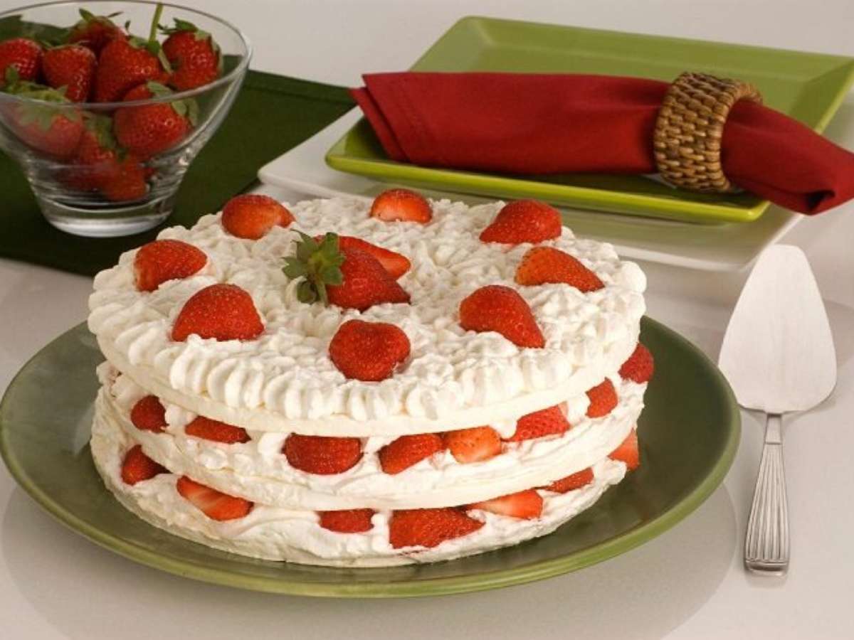 - Em um prato, coloque um disco de suspiro, cubra com uma porção generosa de chantilly, espalhe parte dos morangos picados e coloque outro disco de suspiro.