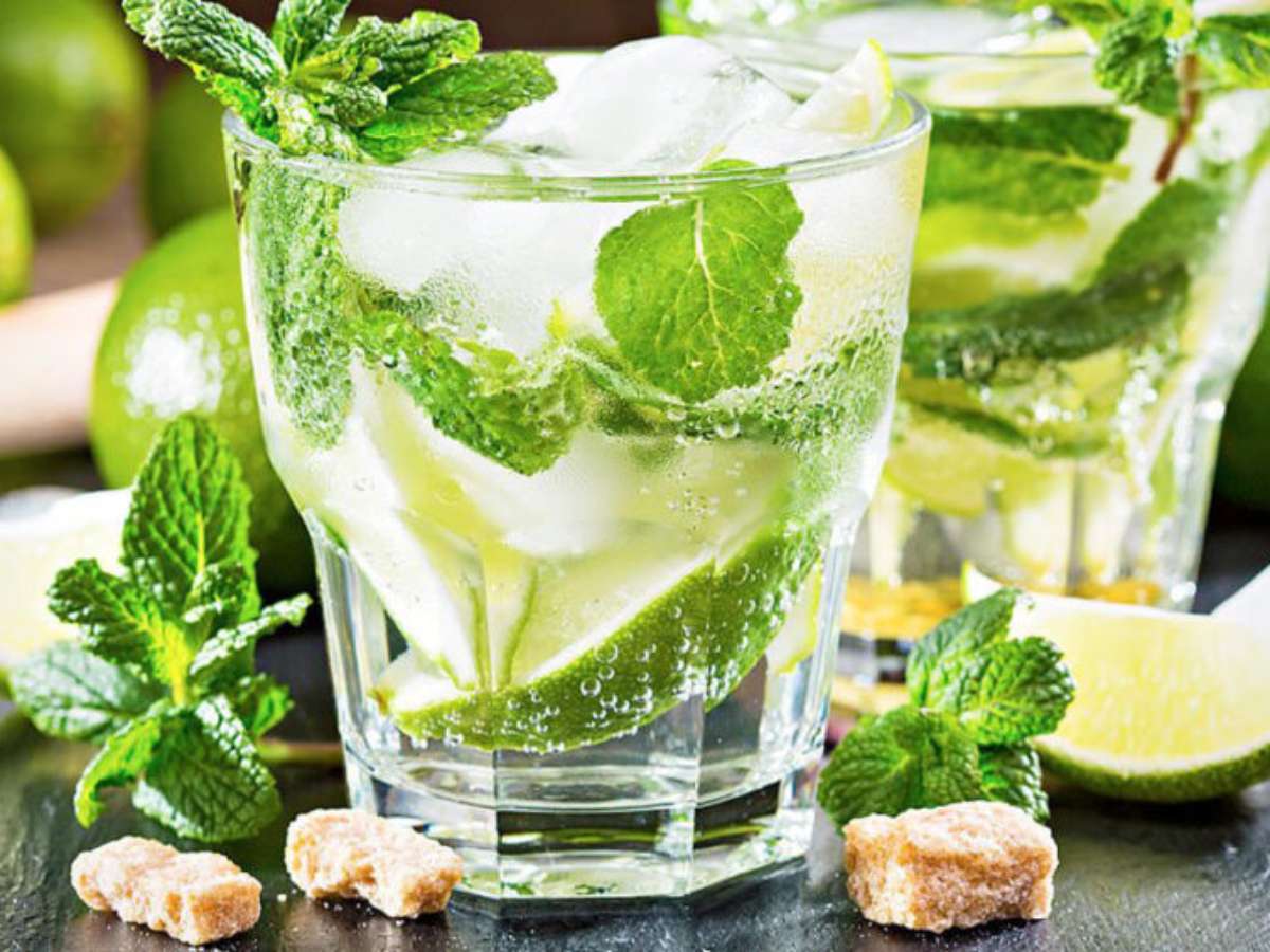Esfregue as laterais internas do copo com 2 folhas de hortelã. Coloque 6 folhas de hortelã dentro do copo, usando inclusive as folhas que aromatizaram. Coloque o açúcar e o suco do limão. Usando um socador, macere as folhas com o açúcar e o limão. Em seguida, misture o rum e complete com água com gás. Coloque as pedras de gelo, misture e sirva em seguida.
