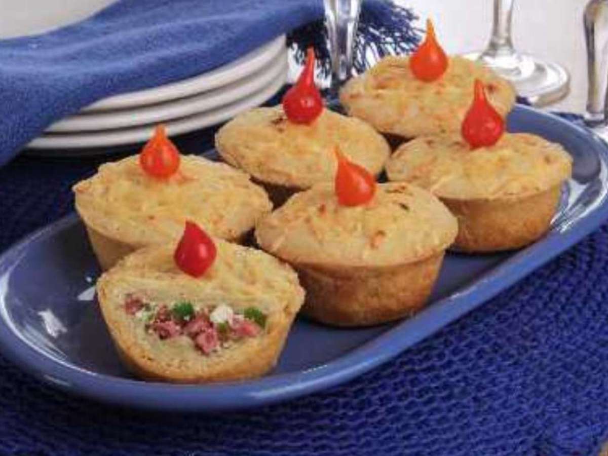 - Forre forminhas de empadas com a massa e distribua o recheio entre elas.