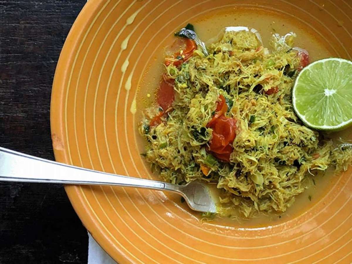 - Desfie o pedaço de bacalhau separando os pedaços com a ponta dos dedos, puxe levemente como se fosse esticá-lo.