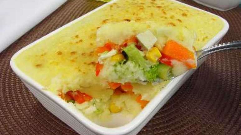 - Em um refratário médio, coloque metade do purê, cubra com o refogado de legumes e finalize com o restante do purê.