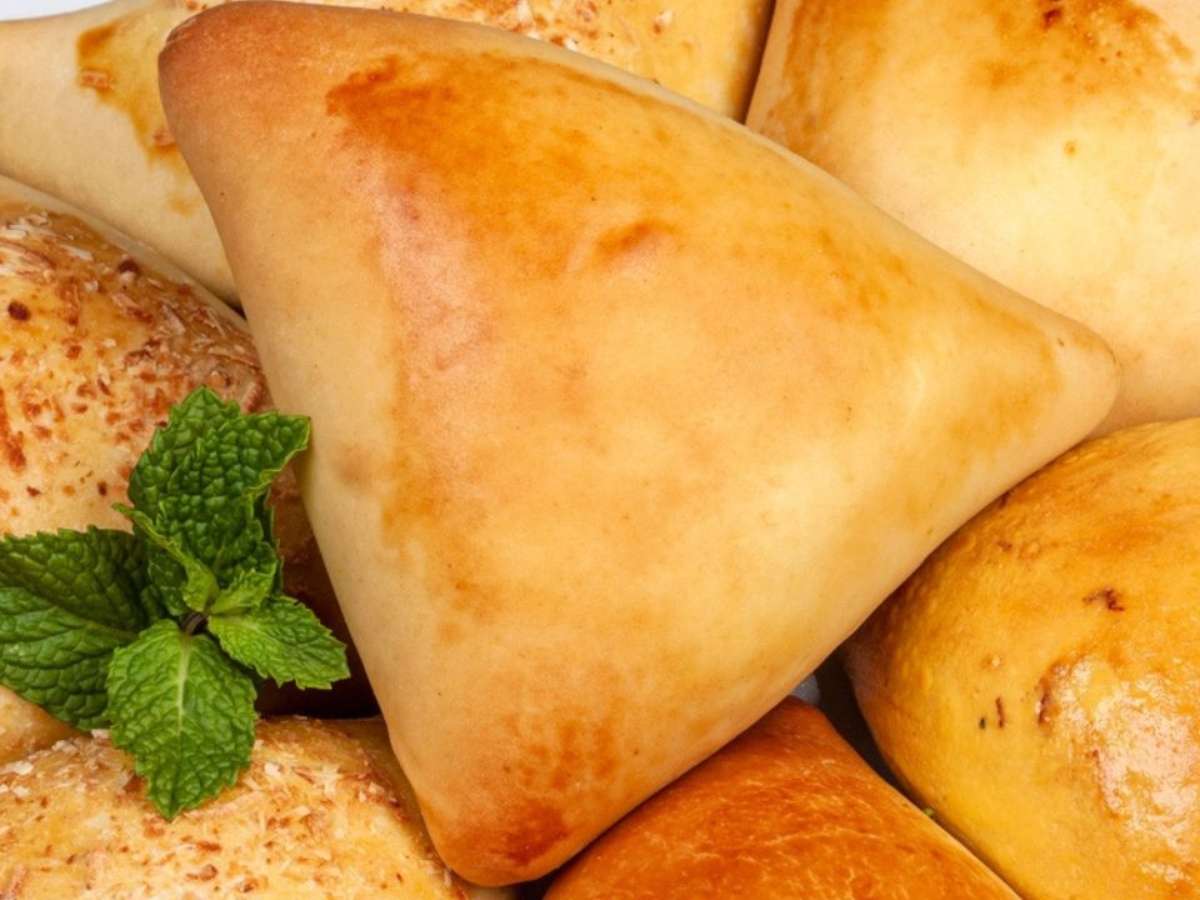 - Misture os ingredientes do recheio, abra cada bolinha com um rolo, coloque o recheio e feche no formato de triângulo.