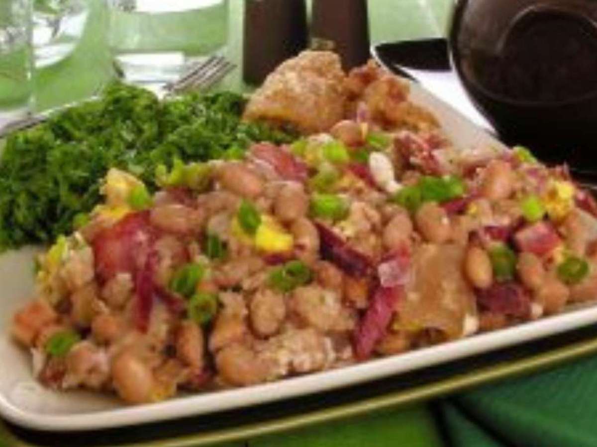 - No momento de servir, misture no feijão o ovo frito picado e a farinha até formar uma farofa úmida.
