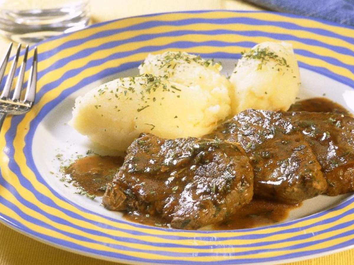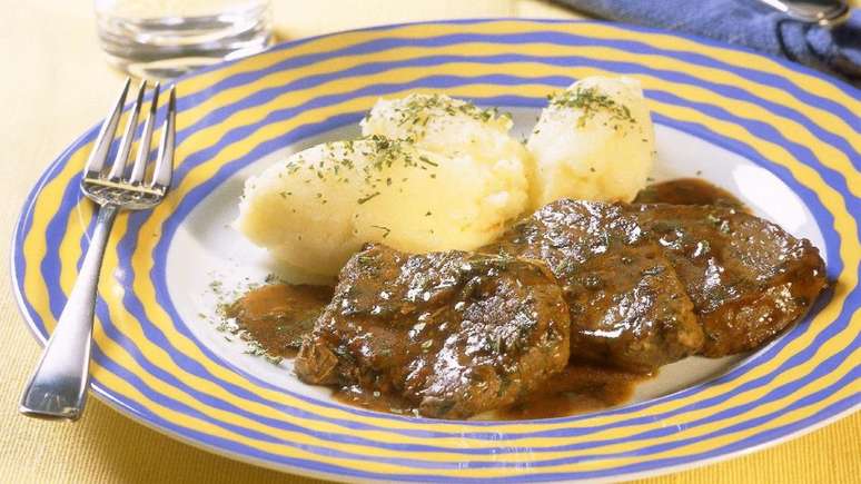 - Fatie o filé, regue com o molho que se formou no cozimento e sirva acompanhado do purê. Se desejar, polvilhe com salsa picada para decorar.