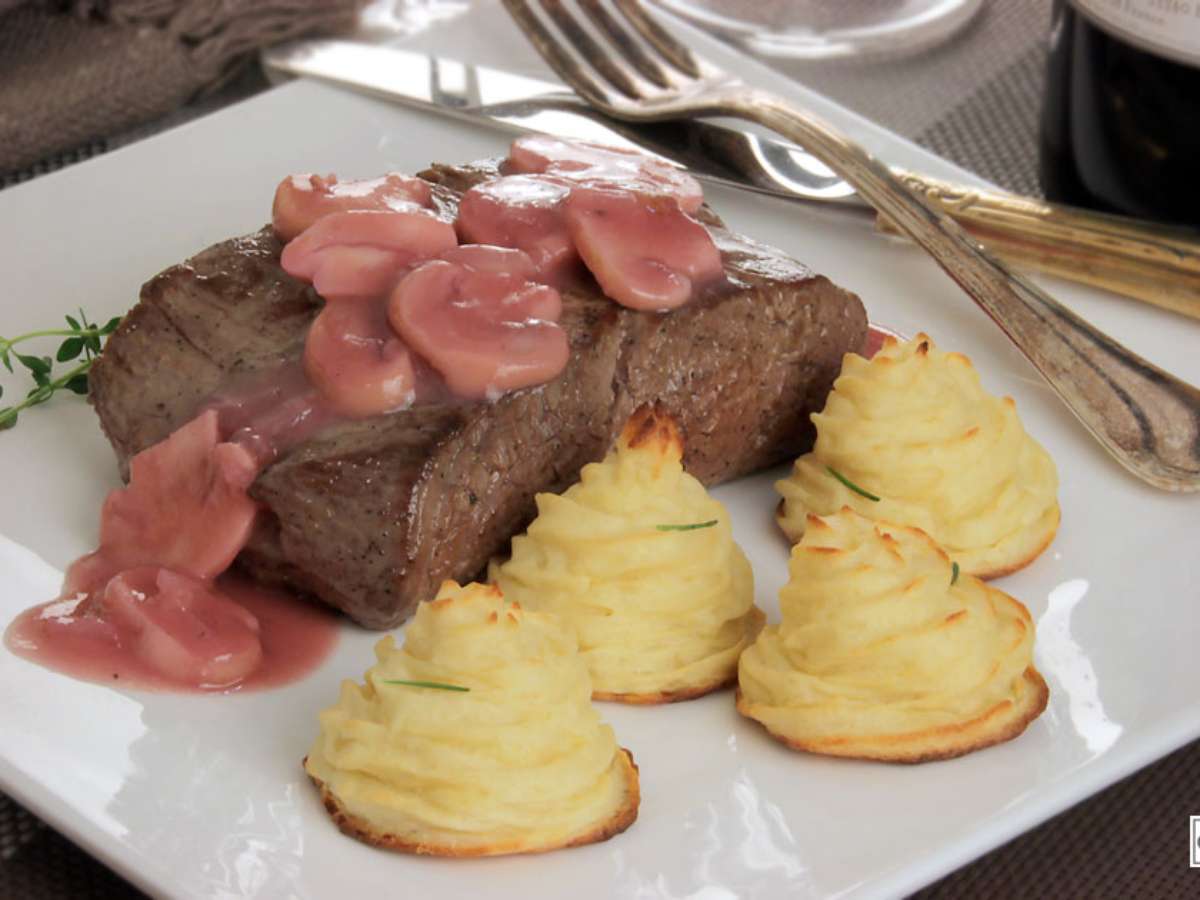 - Junte o caldo de carne dissolvido na água morna e cozinhe até encorpar levemente. Regue os bifes e sirva acompanhado da batata duchesse e decorado com tomilho