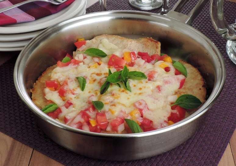 - Retire do fogo, cubra com o tomate, a cebola e o pimentão misturados e polvilhe com a mussarela.